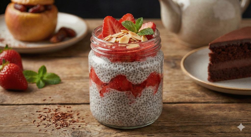 To jeden z kolorowych deserów, idealnych na letnie przyjęcia. Jest nie tylko apetyczny, ale także zachwyca smakiem. Herbatę rooibos, ekstrakt z wanilii i skórkę cytryny zalej wrzącą wodą i odstaw do wystudzenia. Po wyciągnięciu rooibosa płyn wymieszaj z wegańskim jogurtem kokosowym. Dodaj nasiona chia, mielony cynamon i dokładnie wymieszaj. Przełóż do miseczek lub mniejszych szklanek. Zmiksuj świeże truskawki na mus, opcjonalnie dodając odrobinę cukru. Bezpośrednio przed podaniem nałóż mus truskawkowy na pudding chia i udekoruj prażonymi migdałami, świeżą truskawką oraz listkiem mięty.